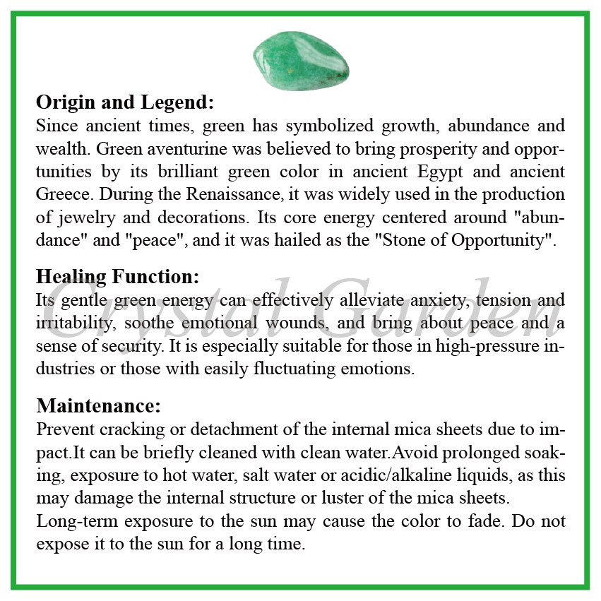 When the sunlight penetrates the translucent texture of Green aventurine, those fine and shiny chromite mica awaken like the morning dew in the forest – as if sealing the entire breathing of the newborn forest into the moist quartz. This healing stone with a delicate sand gold effect not only carries the vital pulse of the earth, but also serves as a spiritual catalyst for wealth and growth.