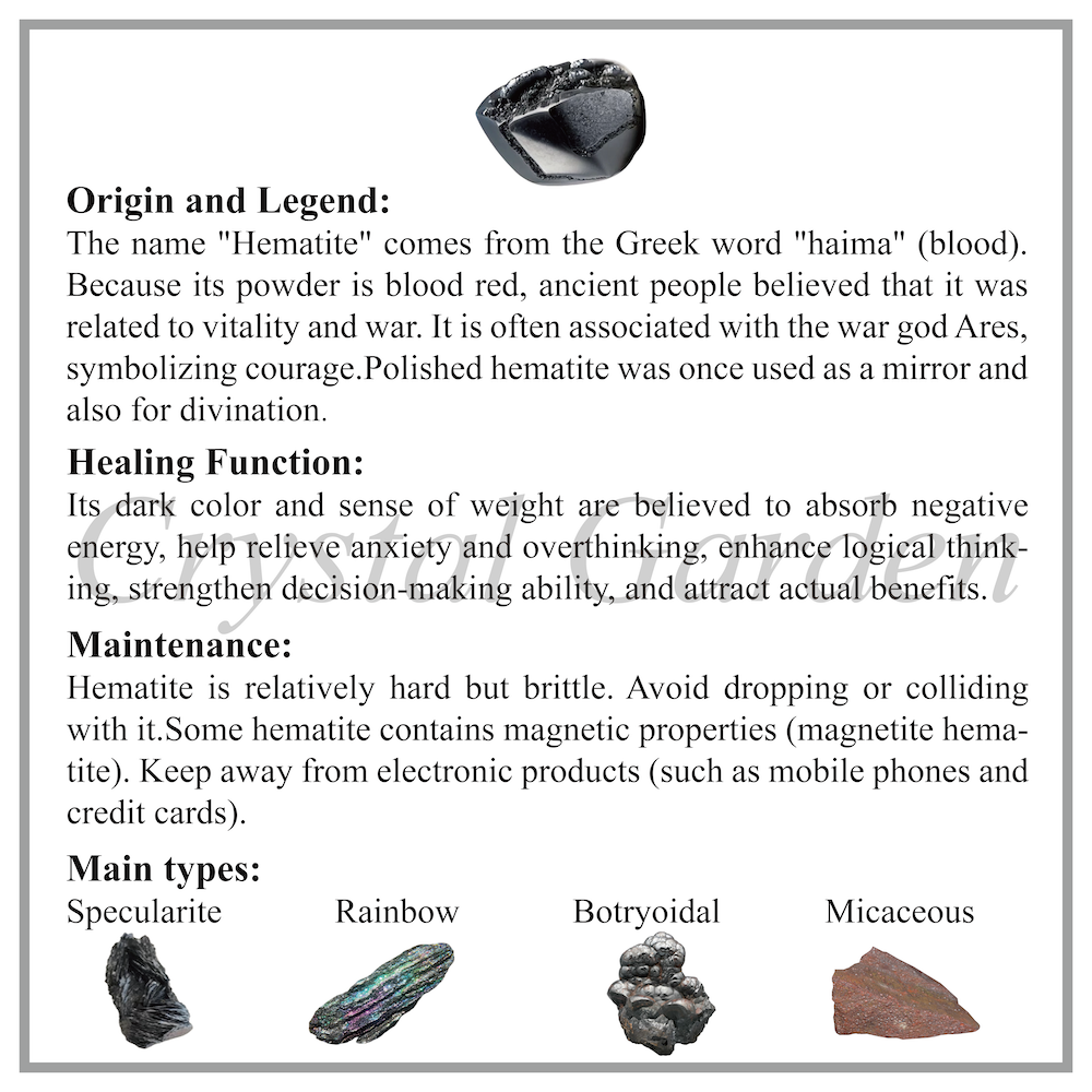 The metallic luster of hematite varies in depth with light, and after polishing, it reflects the world like a mirror. Unlike other crystals, it has a strong sense of weight. When held in the hand, one can feel that solid force.